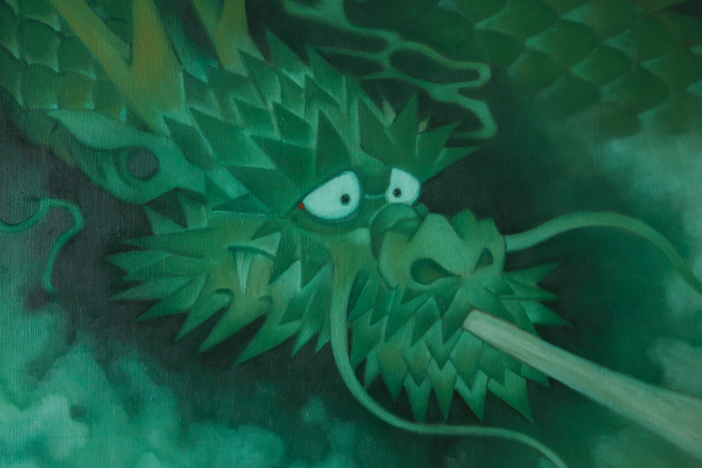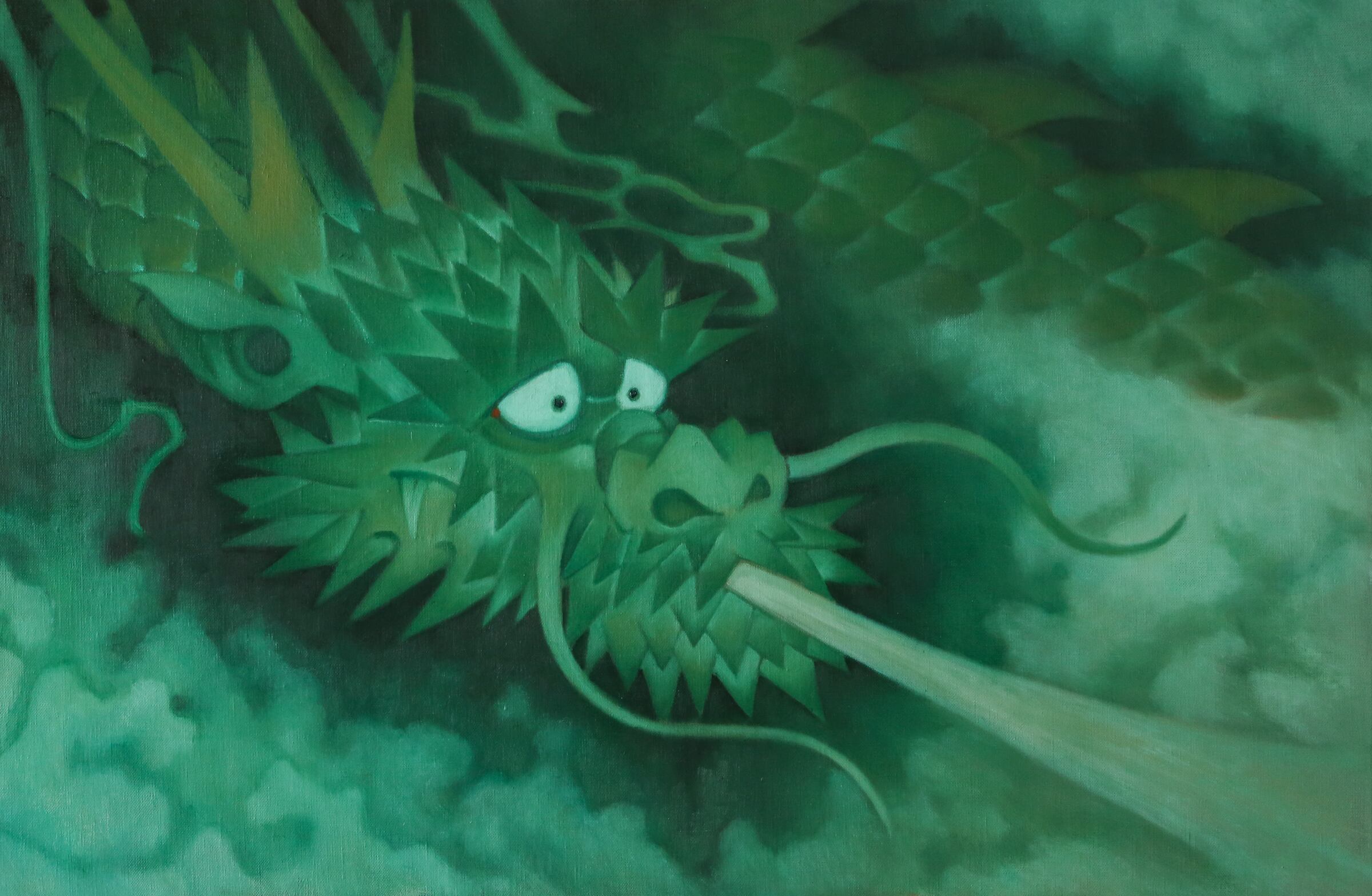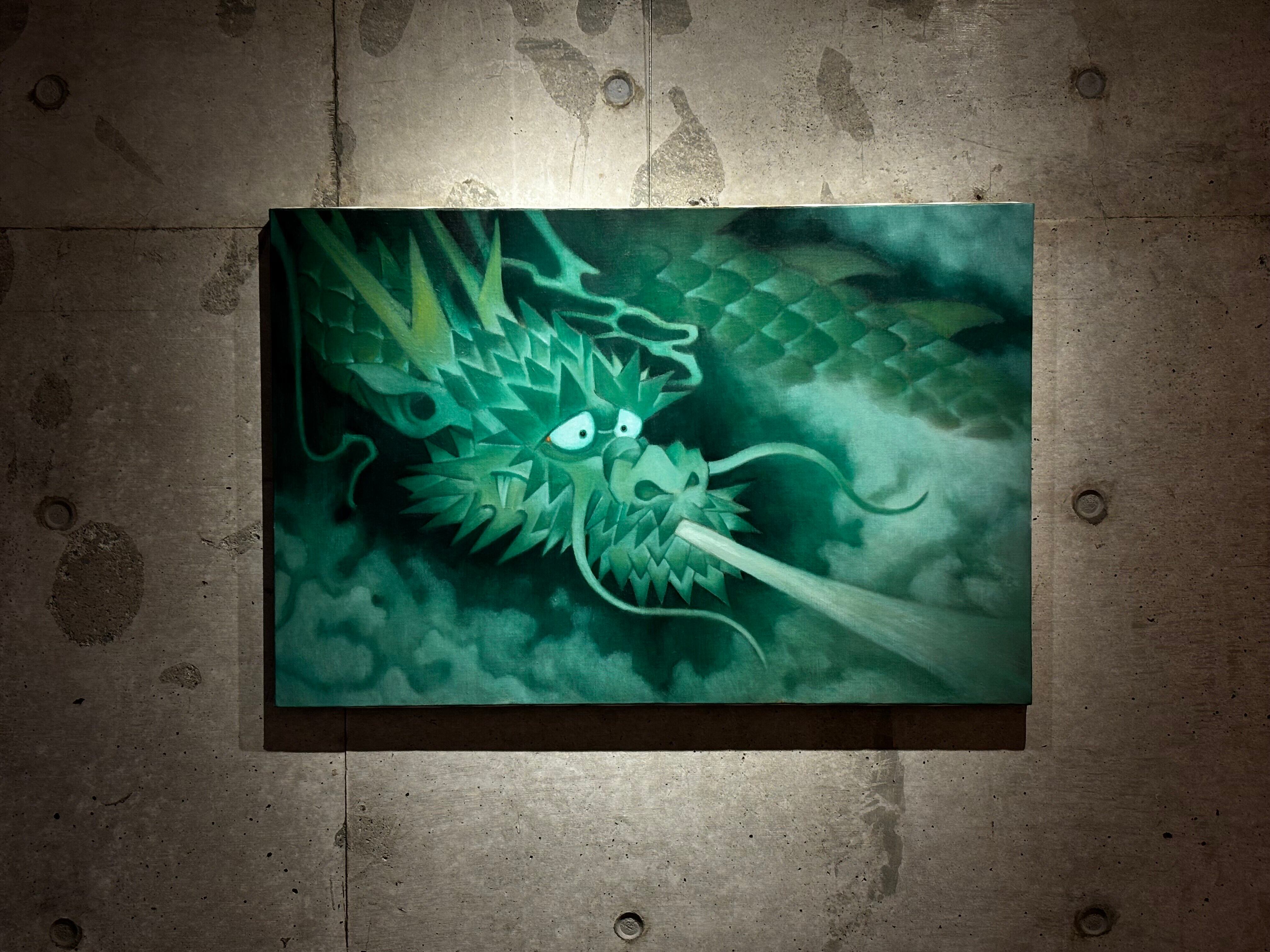 油彩を用いてキャンバスに雲の切れ間から顔を覗かせ、口から風を生み出す龍神の姿を描きました。ビリジアンという色を使用した独特の鮮やかなグリーンが特徴の本作は長く見ていると仄かに発光しているように感じられます。スマホの液晶ライトに慣れてしまった我々にとって絵の具の発する光はあまりにも弱いものとなってしまいました。それでもその光を使って淡く輝く龍を描こうと試みています。静かに見つめてもらえばきっとその光は観る者に届くだろうと信じています。