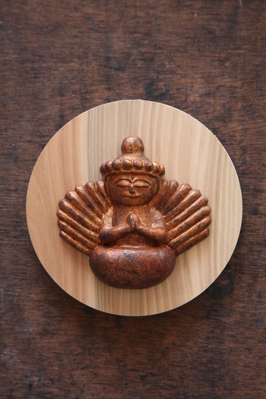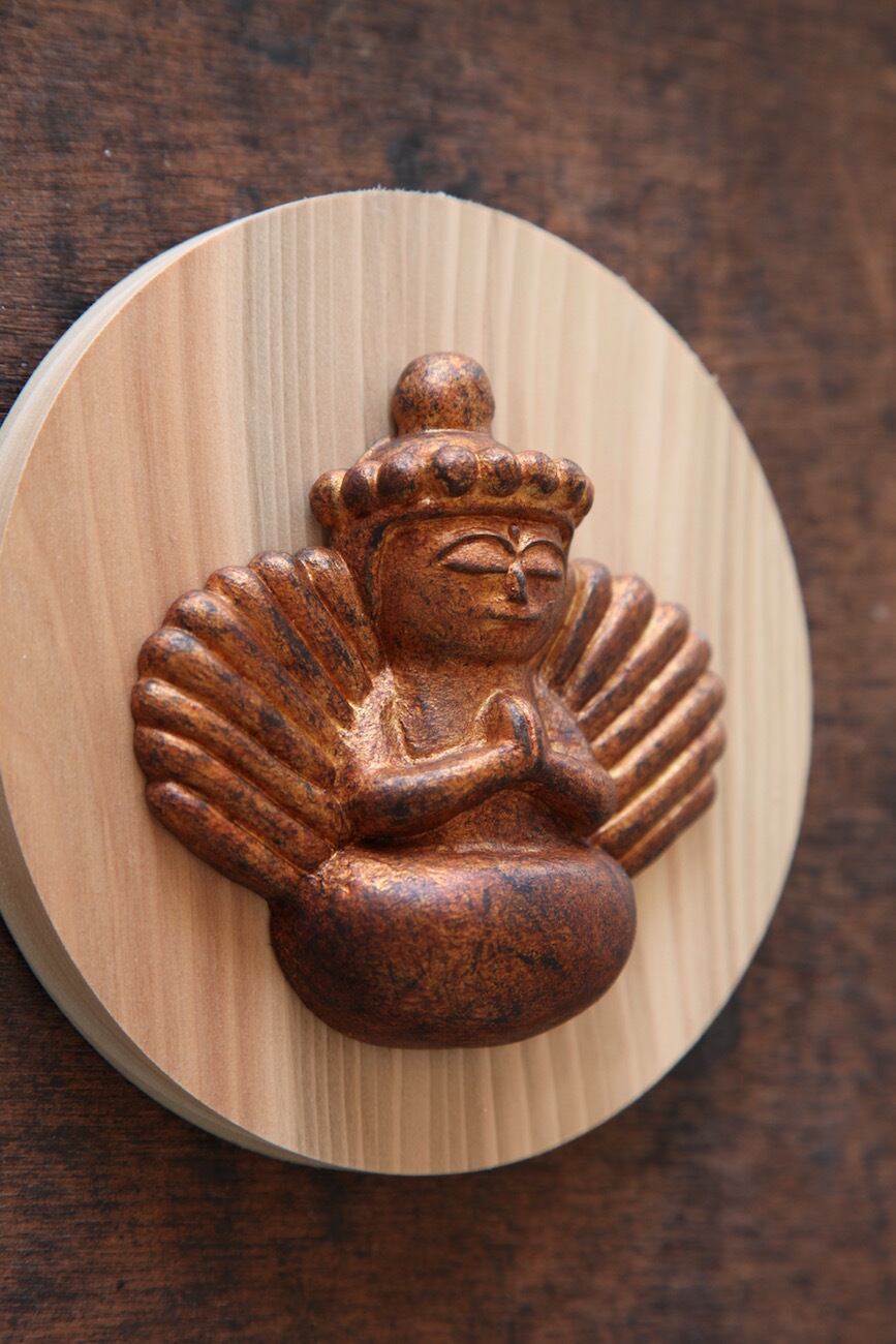 懸仏をモチーフにした塑像です。彩色はアクリル塗料で古色風に仕上げております。