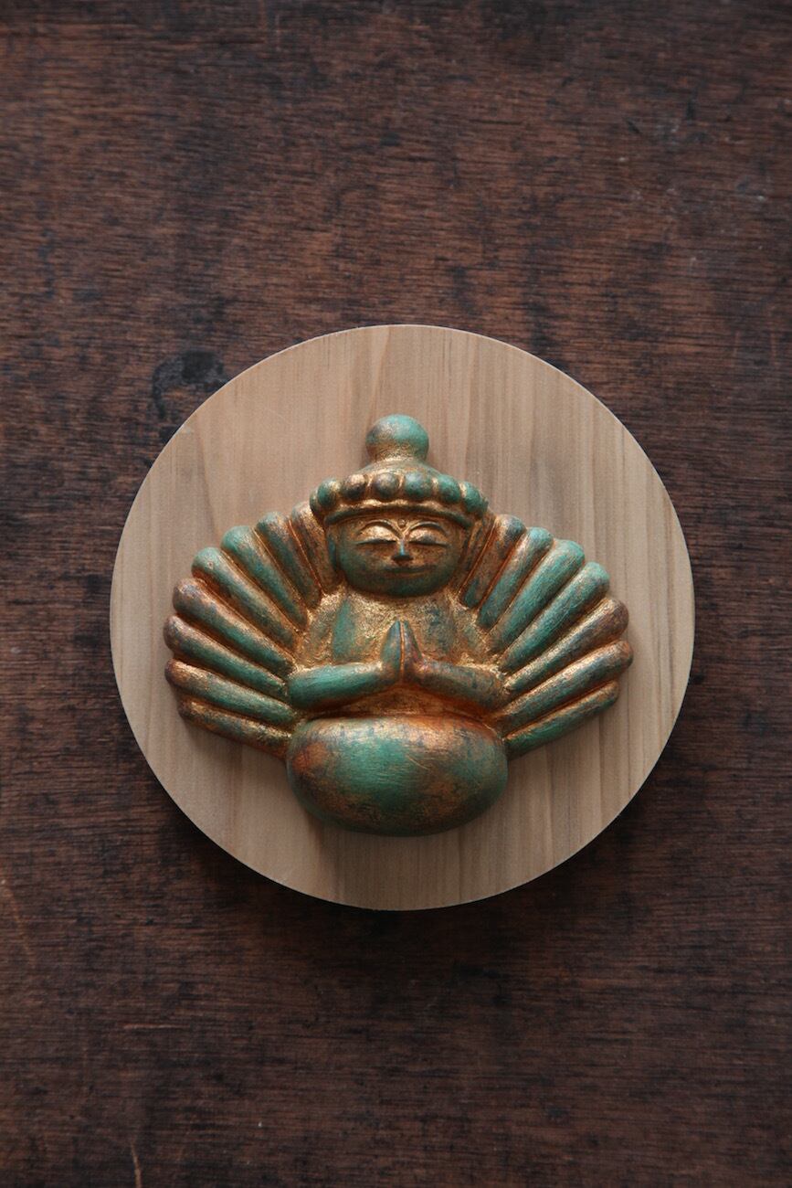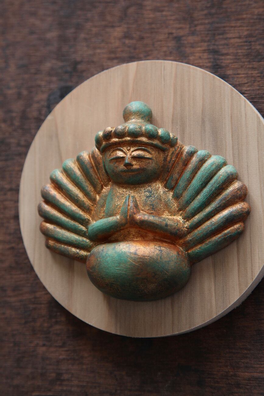 懸仏をモチーフにした塑像です。彩色はアクリル塗料で古色風に仕上げております。
