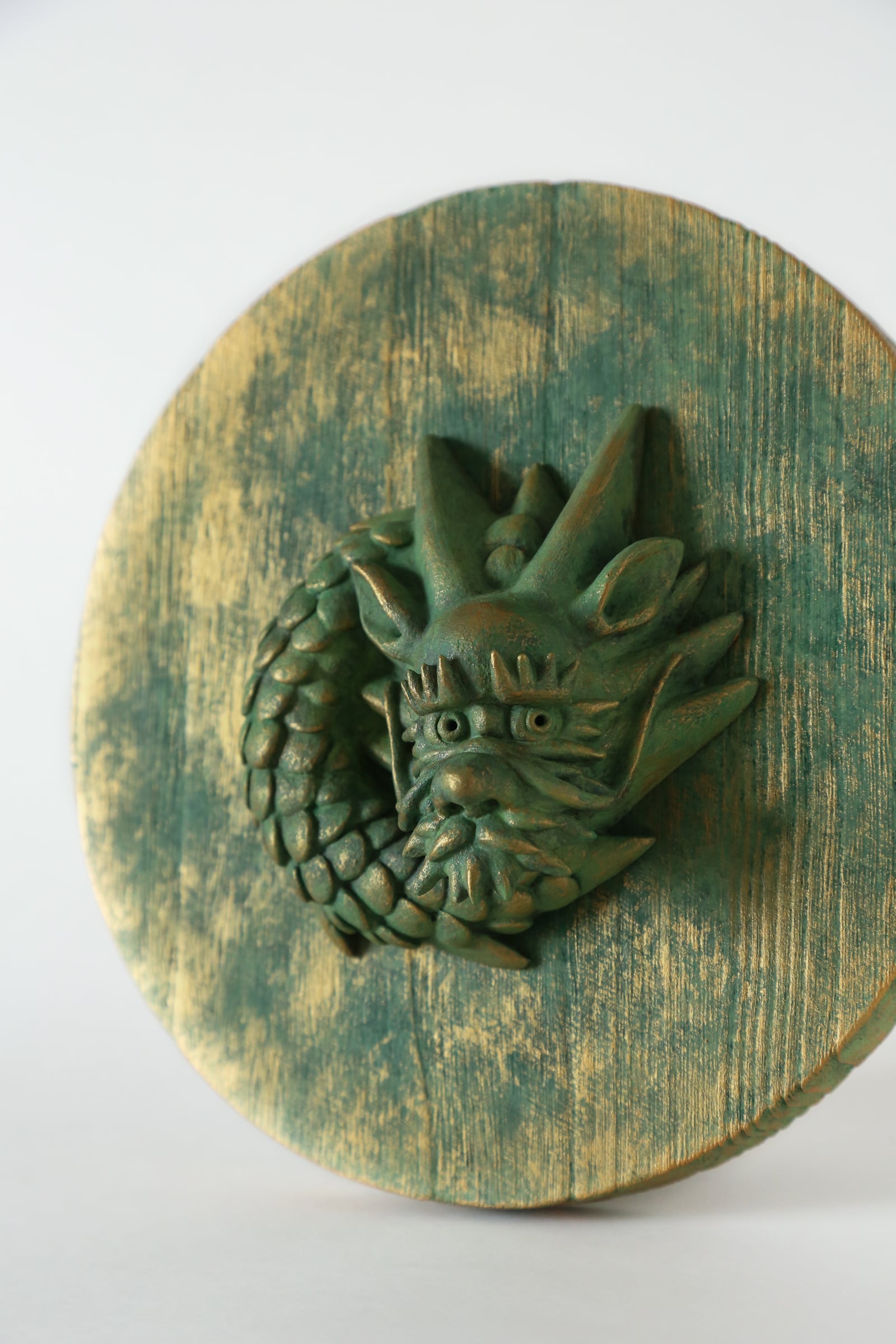 禅における円相、あるいはウロボロスのように、身体をくねらせて円を描く龍神の像を制作しました。円相やウロボロスは、「始まりもなく終わりもないもの」の象徴として宇宙の真理を表しています。本作はそんな壮大なテーマを抱えながらも、どこか戯けたような表情をしており親しみやすさを感じさせます。彩色は墨やアクリル塗料を用いて落ち着きのある古色風に仕上げております